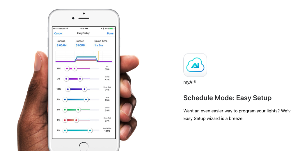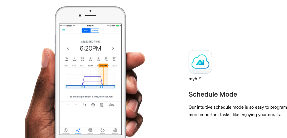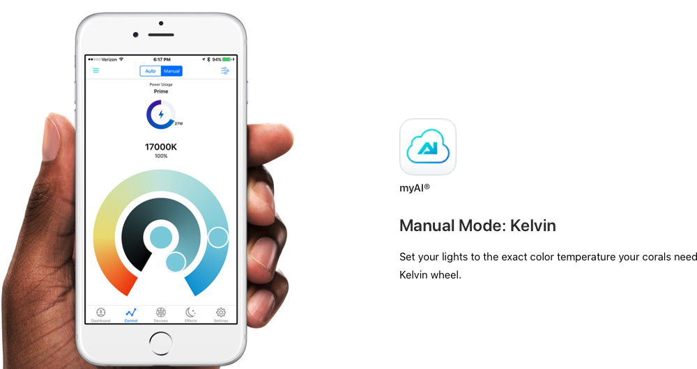Mit einer Streuung von 24 ″ x 24 ″ hat der AI Prime® 16HD einen Spitzen-PAR von 100µMol in einer Tiefe von 24 Zoll, ideal für kleine bis mittlere Riffbecken. Sie benötigt maximal 55 Watt und folgt damit den effizienten Schritten der Familie.
