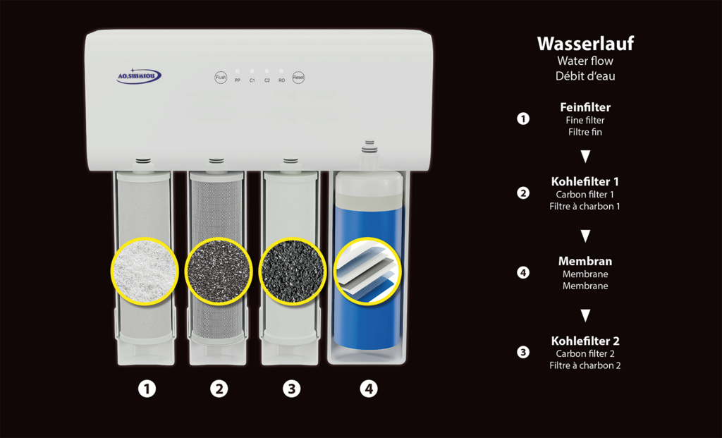 Wasser filtert. Zum Abschluss durchläuft das Wasser einen zweiten