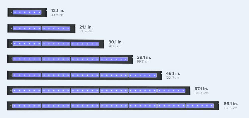 Die Leuchten der AI BLADE Serie verwenden eine Cluster-Gruppen-Konfiguration. Jede BLADE-Größe umfasst etwa eine Clustergruppe pro 30,5 cm. Die enge Gruppierung und die ausgewogene Diodenplatzierung ermöglichen größtmögliche Ausgewogenheit und einen angenehmen Schimmer.