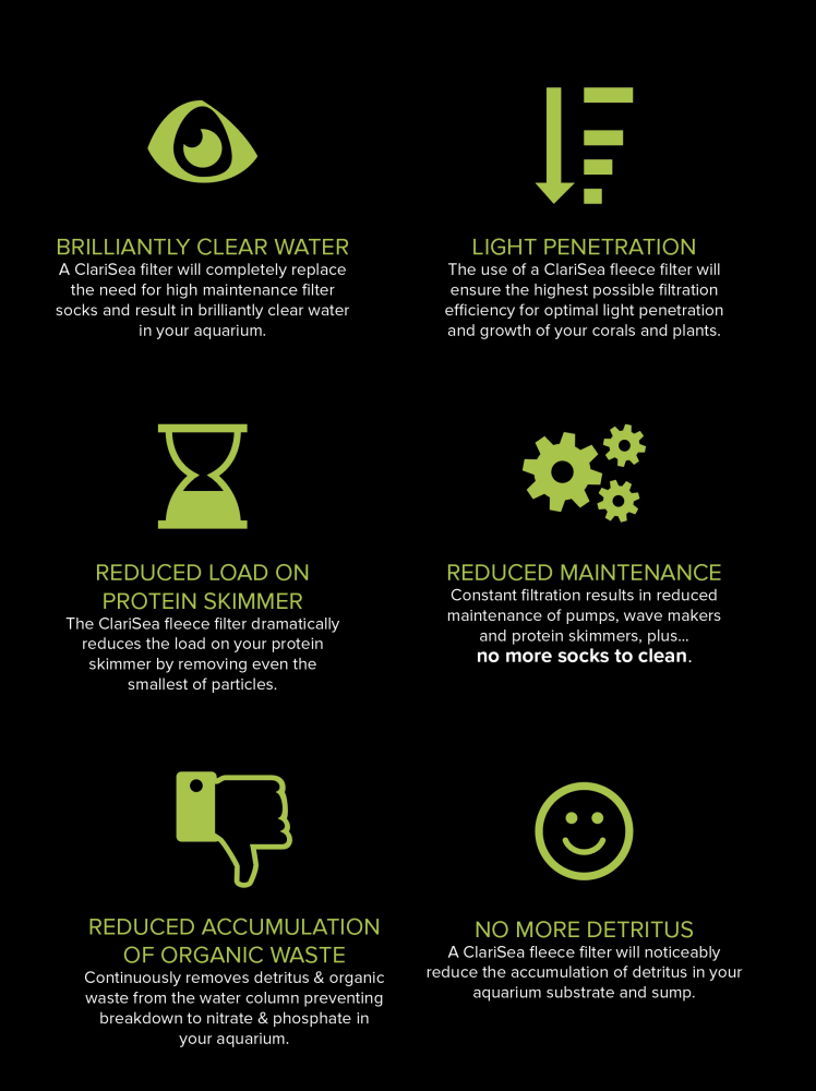 Durch die Entfernung kleinster Partikel reduziert er die Belastung des Eiweißabschäumers drastisch. Die konstante Filtrierung führt zu einem reduzierten Wartungsaufwand von Pumpen und Abschäumern. Der ClariSea Vliesfilter reduziert spürbar die Ansammlung von Detritus im Aquariumsubstrat und -sumpf.