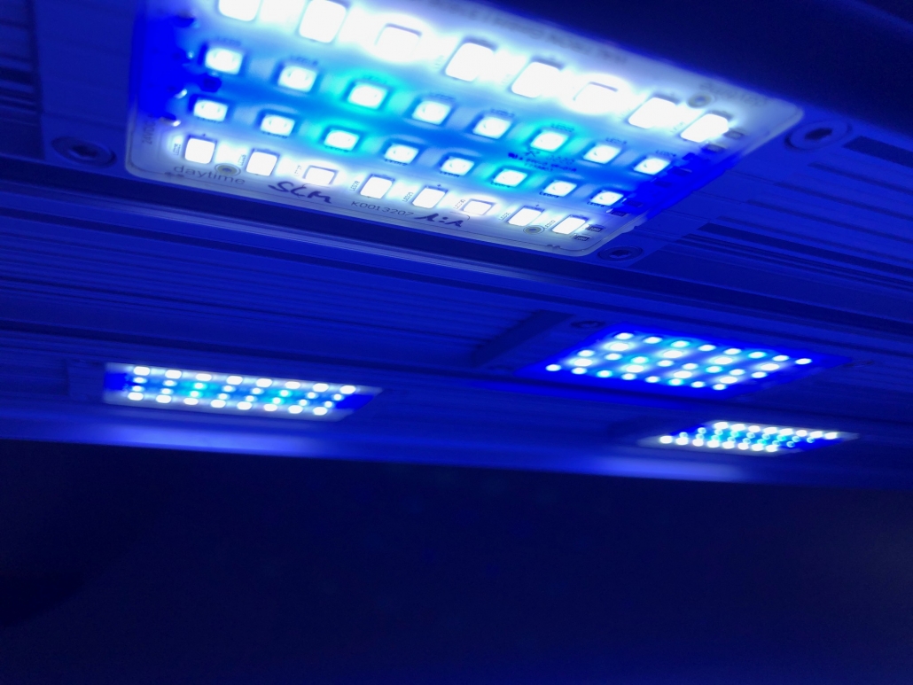 Modulare LED Aquariebeleuchtung zur Installation über offen betriebenen Meerwasser-Aquarien. Inklusive LED-Modulen, Converter und Seilaufhängung