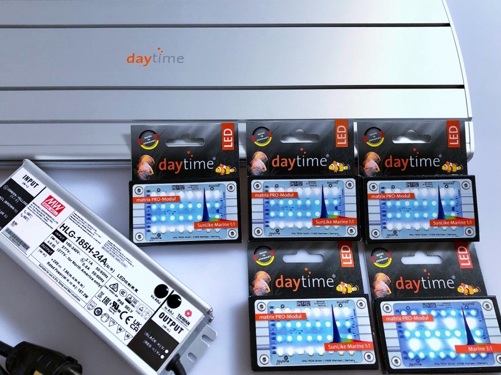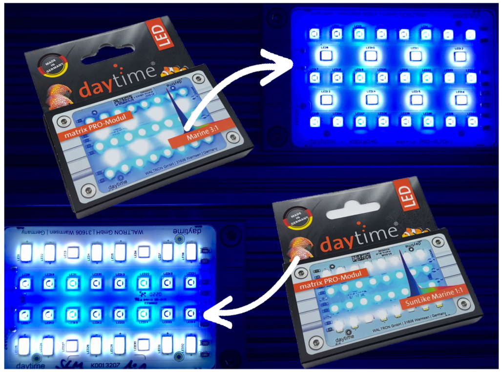 | Set | Profillänge | PRO-Module SunLike Marine | Set-Leistung | PAR* Wassertiefe ca. 10 cm | PAR* Wassertiefe ca. 50 cm | PUR | Ideal für Aquarien | beiliegender Converter |