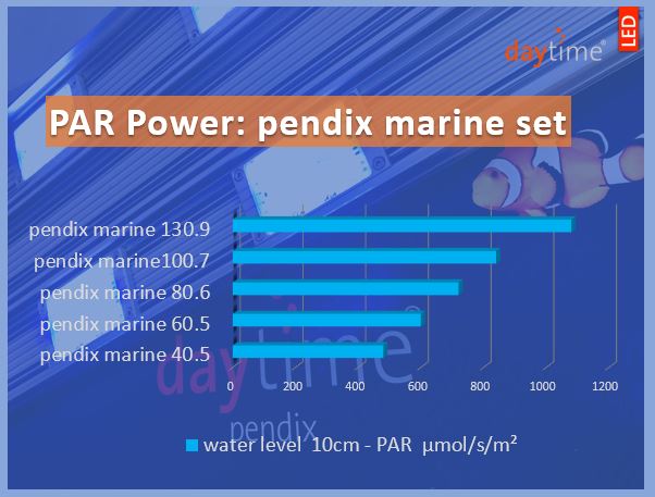 | pendix100.7 Marine | 100 cm | 4x SLM1:1 3x SLM3:1 | 70 Watt | 840 µmol/s/m² | 175 µmol/s/m² | 96% | vom 120x40x40 bis 130x60x60 cm | 240 Watt (für max. 24 Module) |