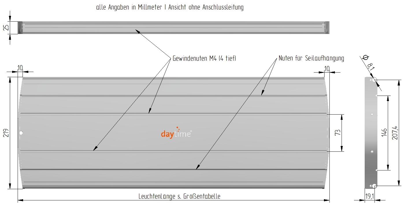 Der Lieferumfang besteht aus daytime pendix mit bestückten LED-Modulen, einem Converter, Schutzscheiben und einer Seilaufhängung. Anzahl der Module und die Leistung des Netzteiles können Sie der unten stehenden Tabelle entnehmen: