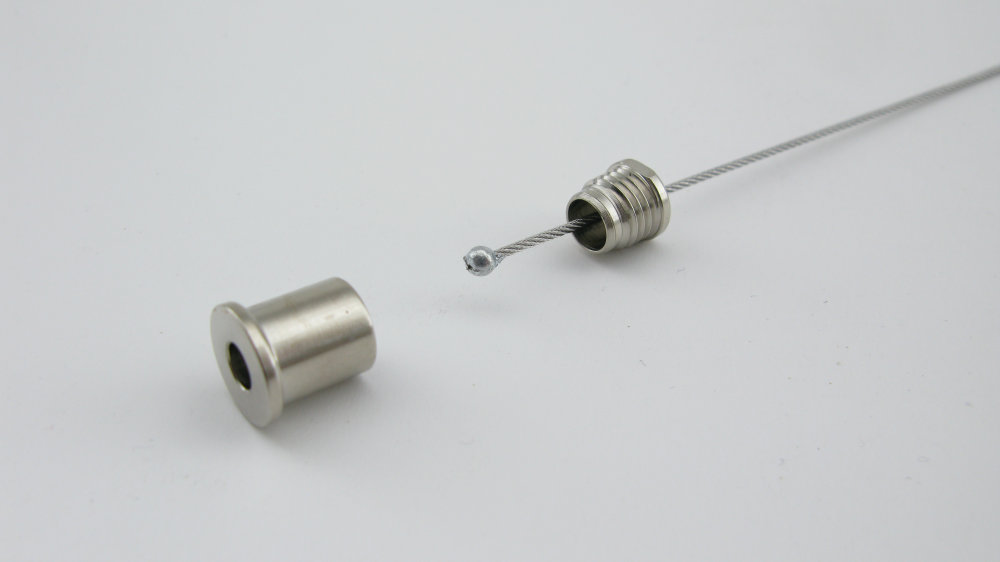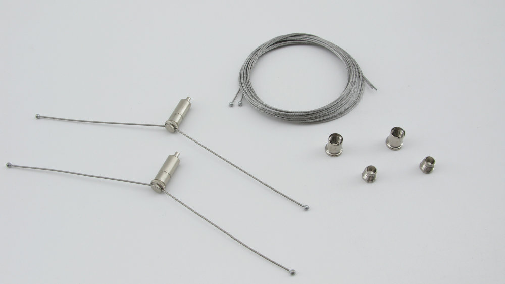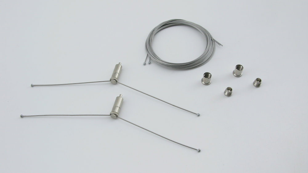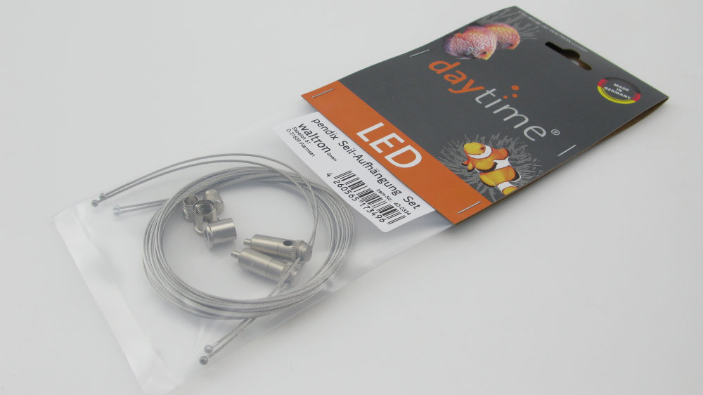 Filigrane Drahtseilaufhängung aus Edelstahl zur freien Aufhängung einer pendix Leuchte über dem Aquarium. Diese kann in der Höhe mühelos ohne Werkzeug verstellt werden. Zudem ermöglicht die „Delta-Verzweigung „eine exakt waagerechte Ausrichtung und Fixierung. Die Länge der Drahtseile beträgt 2 Meter.