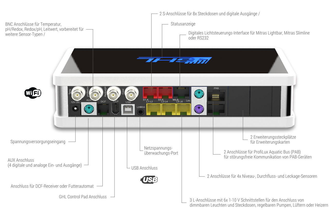 USB und WiFi sorgen für eine optimale Konnektivität, per Webinterface, Email und Cloud-Service bleiben Sie stets bestens über die Vorgänge in Ihrem Aquarium informiert.