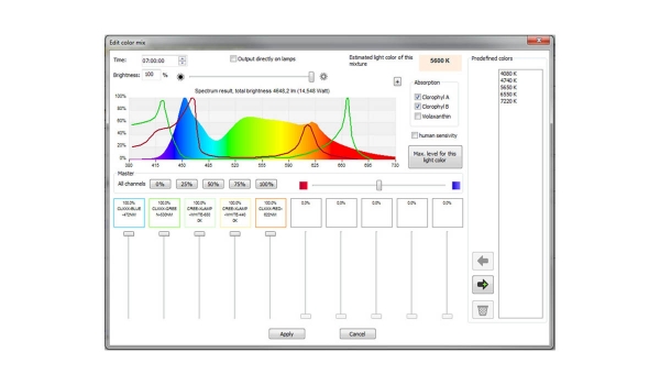 Stellen Sie Ihre gewünschte Beleuchtungskurven individuell ein. Die Lichtfarbe und die Beleuchtungsintensität kann über den Tagesverlauf variiert werden. Entweder übernehmen Sie einfach eines der bereits vorhandenen Beleuchtungsprojekte für Ihre Mitras®LX7, oder Sie erstellen sich Ihre eigenen.