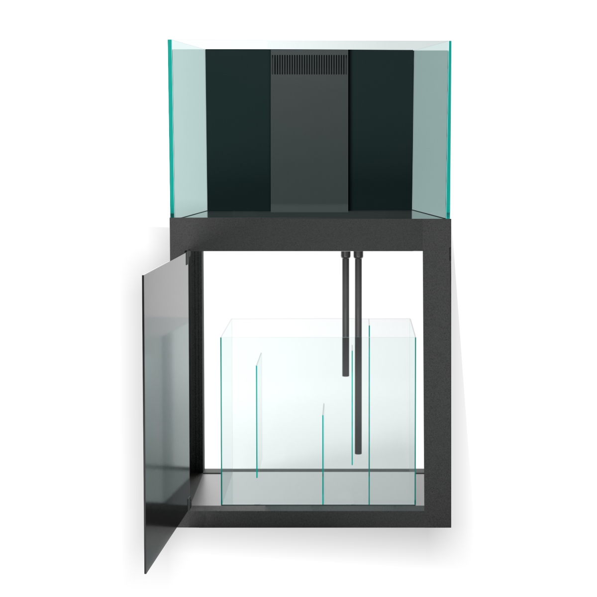 Die Aquarienrückwände dieser Aquariensysteme sind schwarz laminiert, der Filterschacht sitzt mittig und das Aquarium ist ein Poolaquarium ohne Streben. Das Herzstück bildet ein extrem stabiles Aluminiumgestell, welches speziell legiert und pulverbeschichtet wird. Absolut Verwindungssteif und Meerwasserresitent.