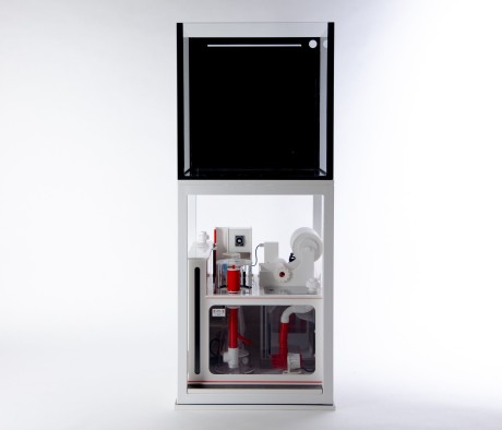 Das Reeftank Systemaquarium Weißglas / Deltec 960 Liter Einfach anders als die Anderen Pool-Aquarium und verkleideter Unterbau 200,00 x 82,00 x 149,00 cm (Maße über alles) Das Reeftank Systemaquarium bietet eine gute und solide Basis für den erfolgreichen und kinderleichten Betrieb eines schönen Meerwasserbiotops. Dieses formschöne System unterscheidet sich nicht nur durch sein randloses Design von vielen herkömmlichen Aquarien, sondern besticht zudem durch ein sehr hochwertig verarbeitetes, pulverbeschichtetes Untergestell, welches in Fragen der Stabilität, Funktionalität und Langlebigkeit Maßstäbe setzt. Die Verblendung des Stahlrahmens zu einem formschönen und zeitlosen Möbelstück, erfolgt über wasserfeste Kunststoffplatten (Vekaplan S Integralschaumplatte), in die Magnete zur Befestigung eingelassen wurden. Zur besseren Belüftung des Schrankinneren bleibt die hintere Aquarienscheibe, an der sich der Ablauf befindet, ohne Verkleidung. Die Schwachstellen anderer Systemaquarien wie: nicht aufeinander abgestimmte Technik, rostende Scharniere, aufgequollenes Holz und laute Ablaufgeräusche, wurden in der Planung dieses Systemaquariums in den Fokus genommen, um diese Fehler bereits von Beginn an auszuschließen und dem Kunden ein System an die Hand geben zu können, welches einfach funktioniert. Das Aquarium ist in Floatglas gefertigt. Alle Glaskomponenten werden aus Floatglas -Made in Germany- gefertigt. Dieses garantiert spannungsfreie Glasscheiben höchster Qualität, welche sehr unempfindlich gegen verkratzen sind. Der Blick ins Aquarium bleibt auch auf Jahre ungetrübt. Um den Rucksacküberlauf zu verdecken, ist die Längsseite, an der sich der Rucksacküberlauf befindet, die Scheibe schwarz lackiert. Das Reeftank Untergestell besteht aus einem 40 mm Stahlrahmen, welcher grundiert und zweifach pulverbeschichtet wurde. Alle Untergestelle der Reeftank Systemaquarien verfügen über eine Lastverteilerplatte aus 19 mm Siebdruck, die auf der Unterseite des Stahlgestells angebracht ist. Dadurch wird Ihr Fußboden optimal vor punktuellen Lastschäden geschützt. Als saubere Auflagefläche für die Filteranlage dient eine weitere Siebdruckplatte auf dem Boden des Schrankinneren. Sie liegt innen auf dem Rahmen des Stahlgestells. Oben auf dem Stahlgestell ist ebenfalls eine Siebdruckplatte befestigt. Somit steht das Aquarium auf einer planen, wasserabweisenden Grundfläche. Dank dieser Bauart wird ein absolut fester Stand gewährleistet, welcher Spannungsschäden am Glas ausschließt. Das Material ist hierbei 100% Meerwasserbeständig. Für eine optimale Funktionalität, hat die Last verteilende Platte einen Überstand von 9 mm über den Rahmen hinaus. Auf diese Weise haben die Türblenden immer eine bündige Auflagefläche. Die störende Optik hängender Türen gehört hierdurch der Vergangenheit an. Jedes Reeftank Systemaquarium verfügt über einen Rucksacküberlauf auf der rückseitigen Aquarienscheibe. Der Rucksacküberlauf hat eine Tiefe von 10 cm und eine Höhe von 30 cm. Die Länge richtet sich nach der Länge des Aquariums. Auf einen Überlaufkamm wird bewusst verzichtet, da dieser sich mit der Zeit zusetzt und so den Wasserstand schwanken lässt. Der Überlauf dieses Systemaquariums wird aus diesem Grund über einen 8 mm breiten Ablaufspalt, 4 cm unterhalb der Beckenoberkante realisiert. Auf diese Weise wird eine optimale Oberflächenabsaugung gewährleistet und einer Kahmhaut effektiv vorgebeugt. Auch werden Fische und andere Organismen davor geschützt, in den Schacht zu geraten. Die Reinigung beschränkt sich auf ein Minimum. Eine klare und saubere Optik wird jederzeit garantiert. Das System verfügt über einen Ablauf und einen Notablauf (55 mm Bohrung für PVC-Fittings in 40 mm). Dies ermöglicht einen absolut sicheren Betrieb und schützt Sie vor Inventarschäden durch überlaufendes Wasser aus dem Aquarium. Der Zulauf erfolgt über eine Bohrung (34 mm Bohrung für 25 mm PVC-Fittings) in der Längsseite des Aquariums neben dem Rucksacküberlauf. Auf diese Weise werden stark unter Druck stehende Bohrungen in der Bodenscheibe vermieden. Dieses sorgt für eine zusätzliche Sicherheit. Das Deltec-System bietet Ihnen mit der Marine Box eine individuell auf Ihr Aquarium abgestimmte Filterlösung, die durch ihre durchdachte Bauweise und einfache Bedienung überzeugt. Das aus dem Aquarium ablaufende Wasser durchströmt zunächst den Vliesbettfilter der Marine Box, der grobe Schmutzpartikel entfernt. Anschließend gelangt das vorgefilterte Wasser in die Kammer des UV-Klärers, der Schwebealgen und Bakterien wirksam abtötet und so für kristallklares Wasser sorgt. Nach der UV-Klärung gelangt das vorgereinigte Wasser in die Kammer des Abschäumers, wo unerwünschte Proteine und andere organische Stoffe abgeschieden werden. Nachdem das Wasser die Abschäumerkammer verlassen hat, fließt es durch die Medienfilterkammer. In dieser Kammer befindet sich der Medienfilter, den Sie mit verschiedenen Filtermaterialien nach Ihren Bedürfnissen bestücken können. So können Sie beispielsweise Aktivkohle zur Geruchsbindung oder Filterwatte zur Feinfilterung einsetzen. Von der Medienfilterkammer fließt das gereinigte Wasser dann in die Kammer mit der Förderpumpe. Die Förderpumpe befördert das gereinigte Wasser anschließend zurück ins Aquarium. Sowohl die Rückförderpumpe als auch die Abschäumerpumpe sind stufenlos regelbar und laufen sehr geräuscharm. Ein integrierter Nachfüllvorratstank mit Nachfüllautomatik sorgt dafür, dass Ihr Aquarium stets mit frischem Osmosewasser versorgt wird. Die Controller der Marine Box sind bequem an der Oberseite der Marine Box angebracht, so dass Sie sie einfach erreichen und bedienen können. Alle Kabel sind sauber verlegt und die Netzstecker sind beschriftet. Die Marine Box ist aus robustem PVC gefertigt und verfügt über eine klar sichtbare Frontplatte. Auch die Abdeckungen bestehen aus durchsichtigem PVC, so dass Sie den Filtervorgang 